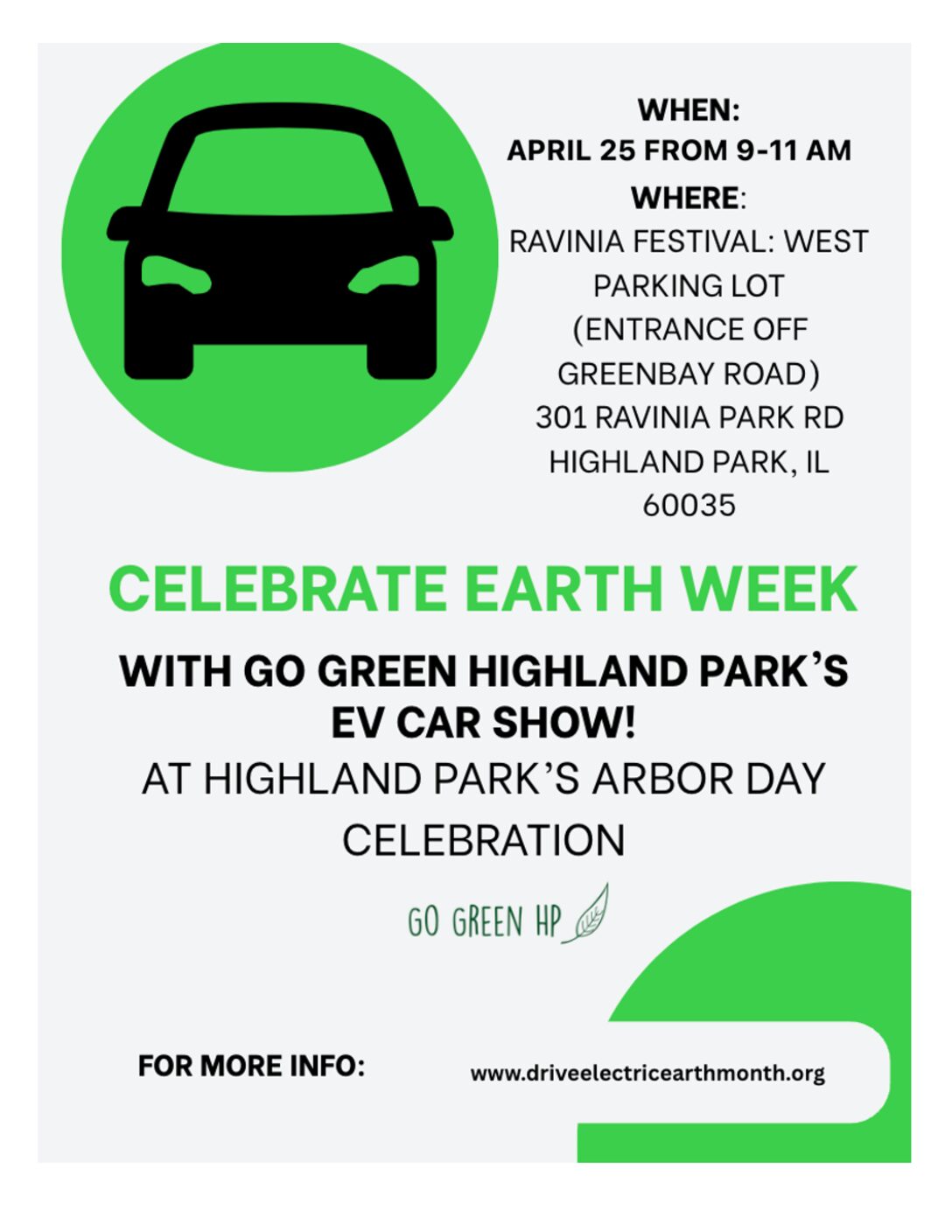 Come join Go Green Highland Park at the Ravinia west parking lot (entrance off of Green Bay Rd) for our annual EV show, in conjunction with the City of Highland Park’s Arbor Day event. We will have many EV models from many makers, including some new for 2026 models. If you are an EV driver we’d love to have you come and share your story. If you want to learn more about EVs or looking for your next vehicle, this is the place to be.